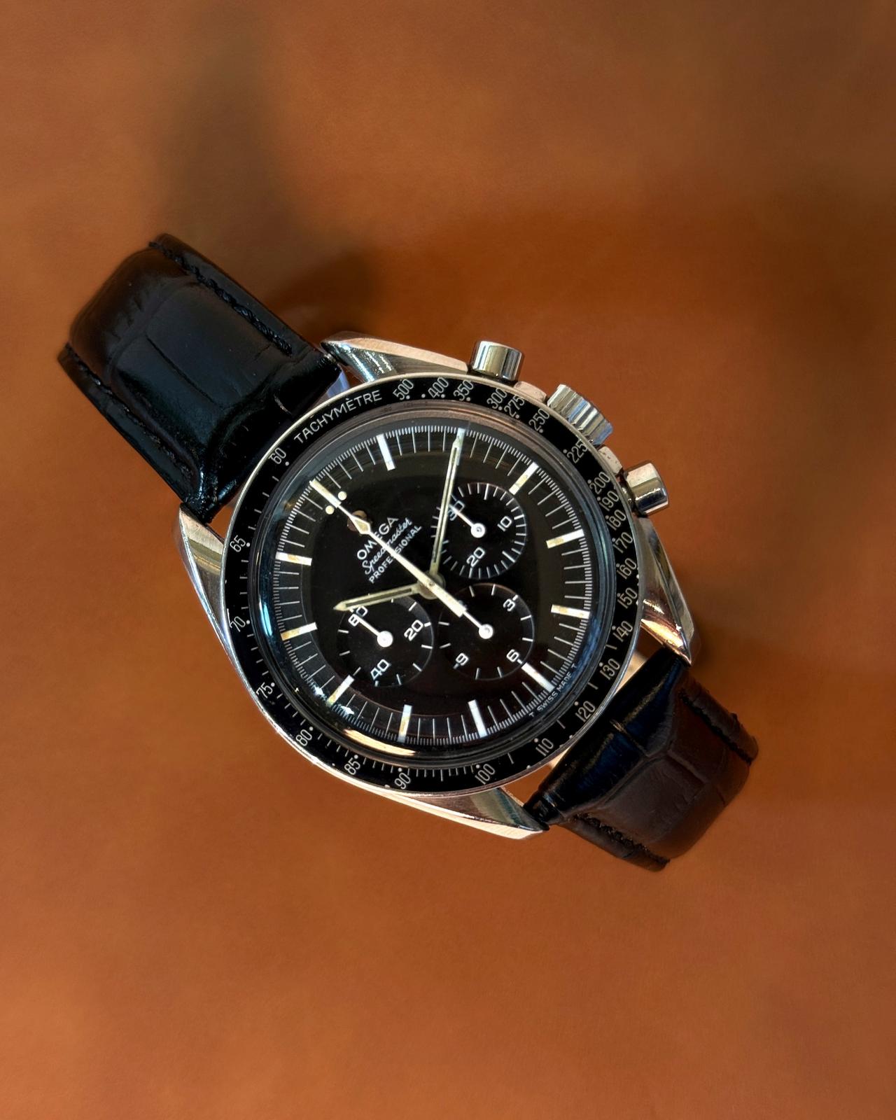 The matte black dial displays luminous painted baton hour markers, outer minute and seconds divisions and outermost 1/5-second markings. The sub-dials include running seconds at 9 o’clock, a 30-minute counter at 3 o’clock and a 12-hour register at 6 o’clock. Luminous baton hands and an arrowhead chronograph seconds hand complete the period-correct layout. The 42 mm case provides the iconic Speedmaster presence associated with this reference.