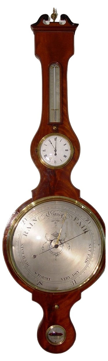 A Giant Size 19th Cent Regency Wheel Barometer With Clock, by J. Pastorelli of London, the main silvered dial below an enamelled 4" clock with fusee movement signed William Terry, London and a mercury thermometer, the case inlaid with boxwood and ebony stringing, height 120cm