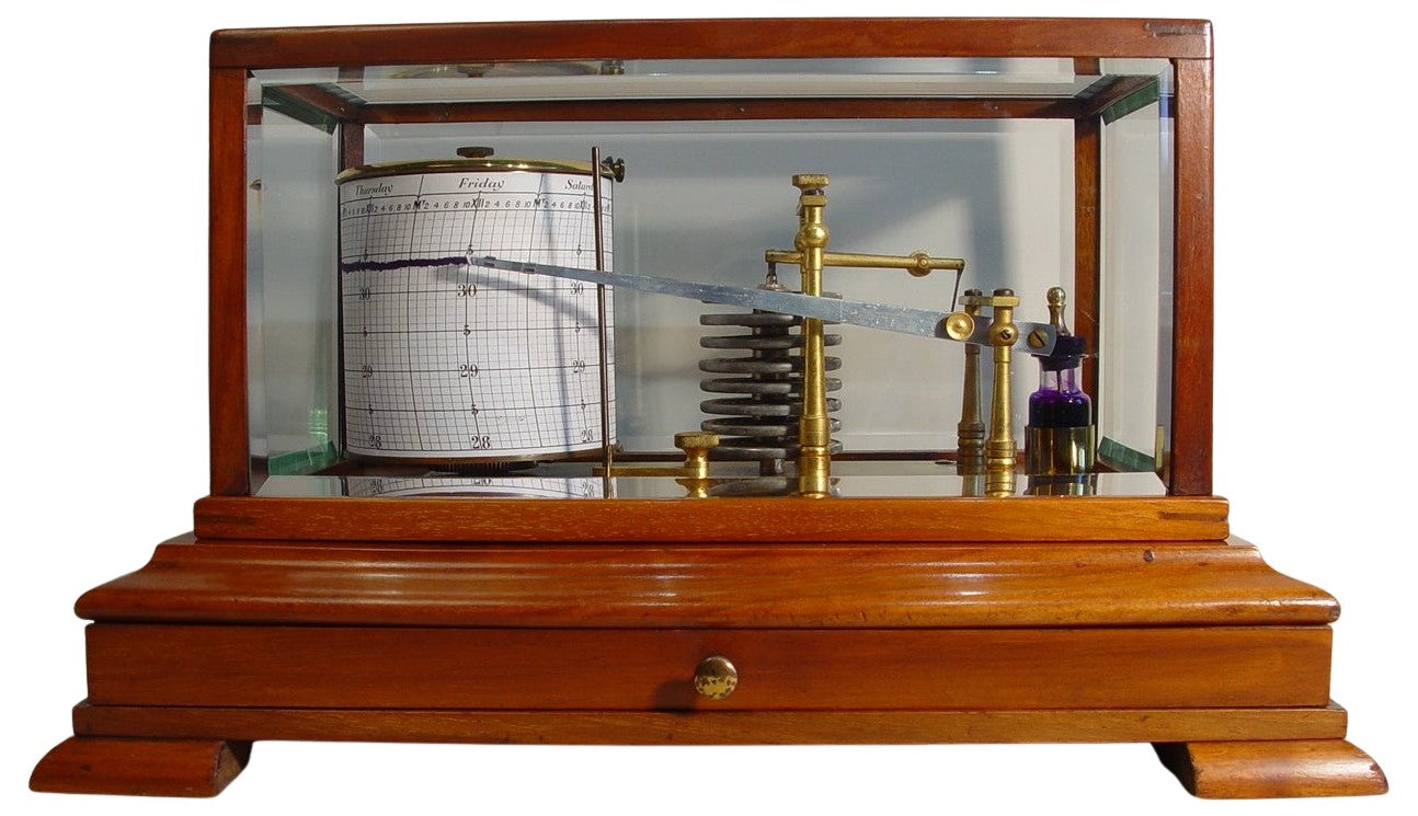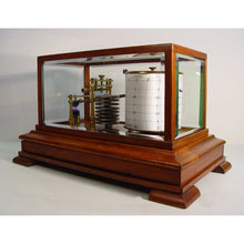 A 1920's Mahogany English Barograph With Chart Draw And Ink Bottle , the fine quality mahogany case with 5 bevelled glasses and a chart draw to the bottom section, the 8-day English movement with original platform escapement, the 8 tier vacuum chamber, the lacquered polished brass interior still retaining its glass ink bottle, Size : 14” x 8½” x 9”.