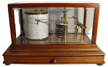 A 1920's Mahogany English Barograph With Chart Draw And Ink Bottle , the fine quality mahogany case with 5 bevelled glasses and a chart draw to the bottom section, the 8-day English movement with original platform escapement, the 8 tier vacuum chamber, the lacquered polished brass interior still retaining its glass ink bottle, Size : 14” x 8½” x 9”