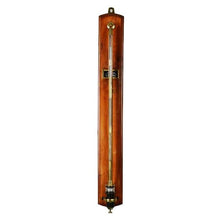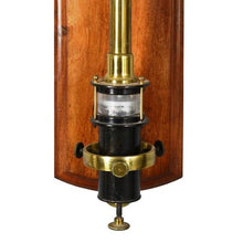 A LATE VICTORIAN LACQUERED BRASS FORTIN-TYPE LABORATORY MERCURY STICK BAROMETER Negretti and Zambra, London, late 19th century The instrument with slender cylindrical case pierced with a vertical slot to reveal the tube incorporating sliding Vernier collar reading against a silvered scale calibrated in barometric inches bordering the right hand side opposing millibar scale to the left, the shaft with Vernier adjustment disc to right over engraved signature H. Negretti & Zambra, 1 Hatton Garden, 122 Regent St. W. & 39 Cornhill, London and applied mercury tube FAHRENHEIT thermometer with canted silvered scale and enclosed bulb to front, the base with cylindrical glass chamber enclosing mercury and incorporating inverted ivory level pointer to interior clamped between horizontal plates over cylindrical cistern and adjustment screw to base, mounted via a brass ring to top and base collar-bracket with triple securing screws onto a rectangular ogee moulded walnut panel with curved top and base and inset with a brass-bordered trade plate inscribed NEGRETTI & ZAMBRA. METEOROLOGICAL, INST'T MAKERS, TO HER MAJESTY, 1 HATTON GARDEN E.C., 59 CORNHILL E.C., 122 REGENT ST. W., LONDON. to centre.The instrument 102cm (40ins) high; the wall panel 103cm (44ins) high, 14cm (5.5ins) wide.