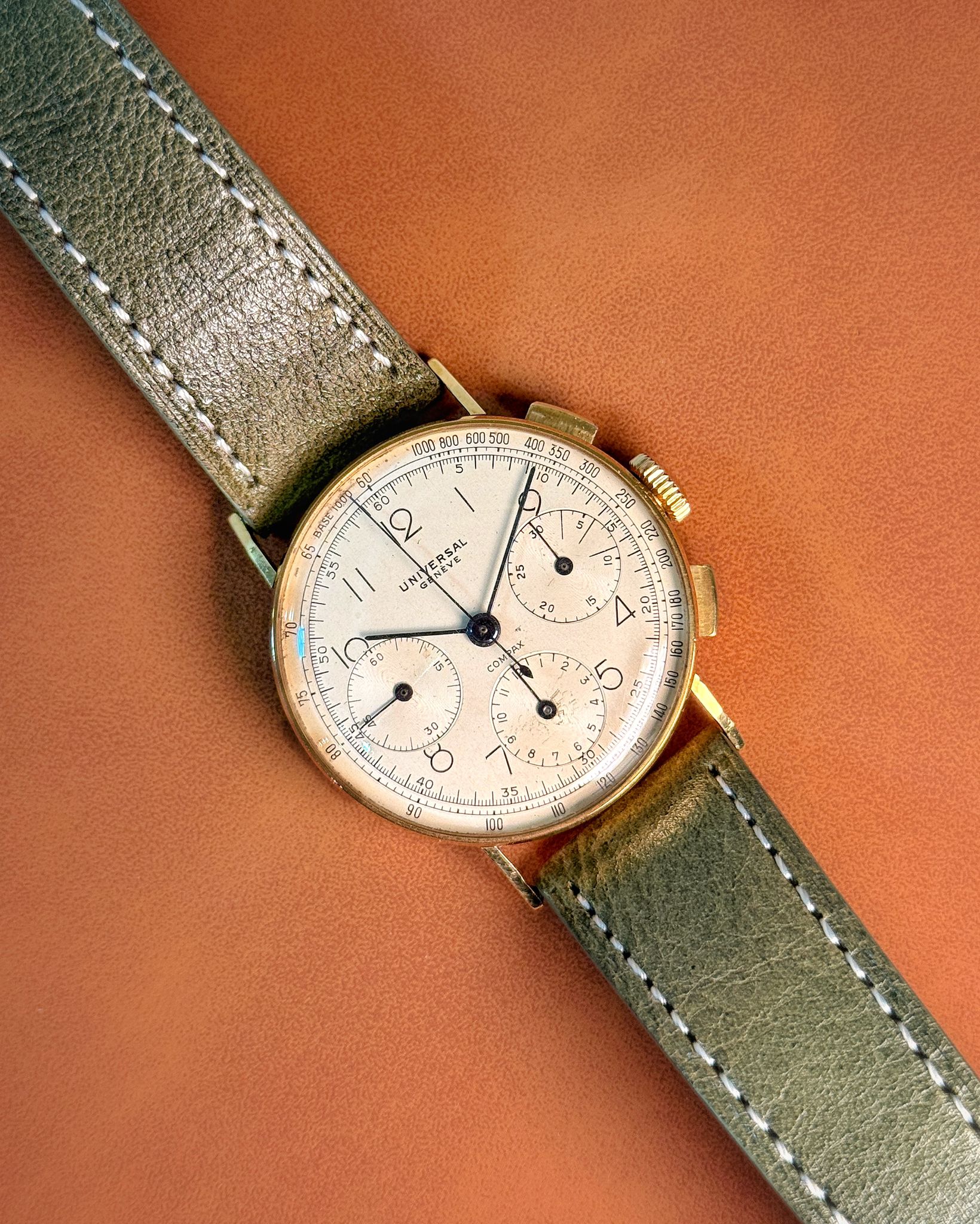 This Universal Genève Compax 12426 comes from the late 1950s to early 1960s, a period remembered for refined Swiss chronograph design. The stepped lugs and slim bezel support a well-balanced tricompax dial layout. The registers typically provide continuous seconds, a 30-minute counter, and a 12-hour totalizer. The case carries the 12426 reference and presents the restrained style associated with mid-century Universal Genève.